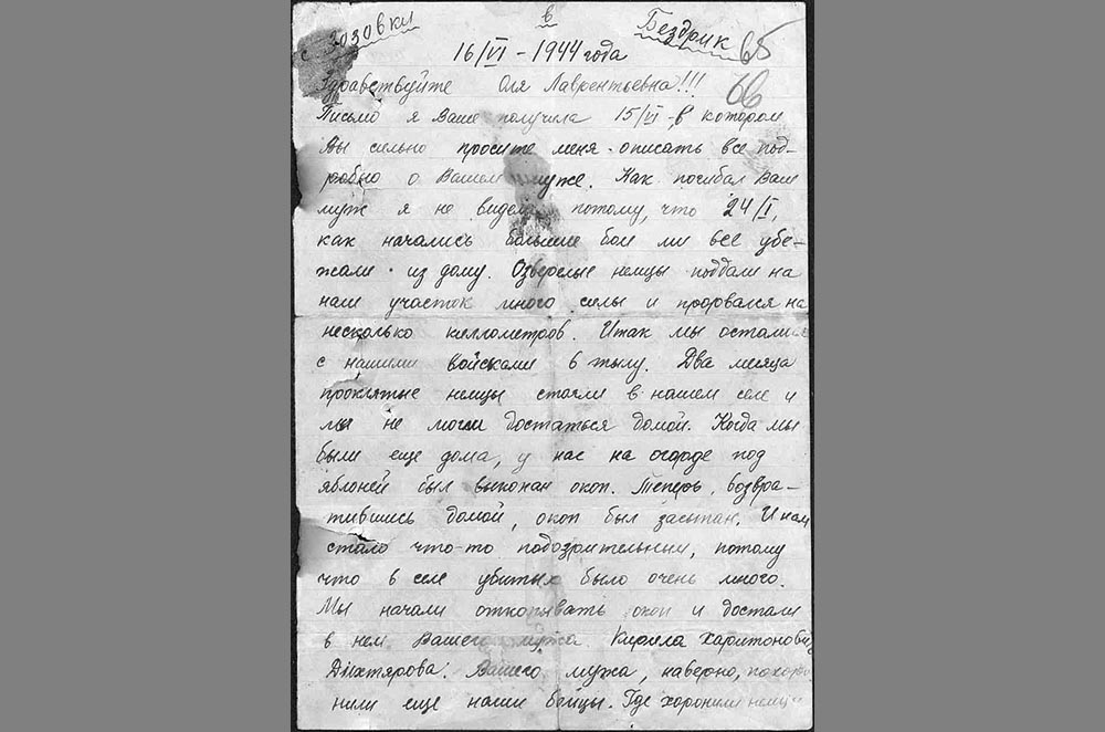 «Дорога Ольго Лаврентіївно, я співчуваю Вашому горю, але прошу не турбуватися про свого чоловіка, він лежить спокійно, а Вам потрібно жити й думати про майбутнє життя…» – написала в листі жінка, яка разом із односельцями перепоховала воїна, загиблого під час вигнання нацистів із її села.