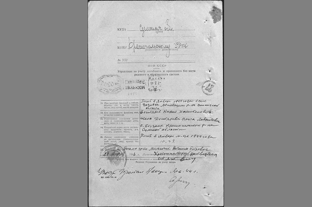 Цей лист з інформацією про майже точну дату смерті й конкретне місце загибелі та поховання сержанта Кирила Дегтярьова був прикріплений до Анкети про пошук, ініційований його дружиною в 1946 р. До моменту подачі такої заяви родина Кирила Харитоновича ще не отримала офіційного сповіщення про його загибель і відповідно не мала права на фінансову допомогу від держави, на яку могли претендувати родичі воїна, полеглого в бою. Понад те, наприкінці Анкети була написана резолюція військкома: «Облікувати зниклим безвісти в січні 1944 р.». Сповіщення з таким формулюванням і без згадки про місце вічного спочинку воїна було видане в червні 1946 р. Ользі Лаврентіївні.
